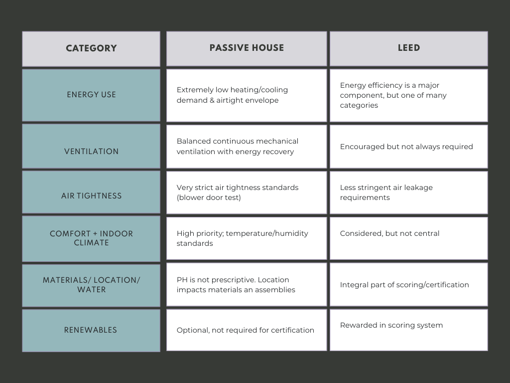 Passive House (or Passivhaus) is a rigorous standard for energy efficiency in a building, aiming to significantly reduce its ecological footprint while ensuring a comfortable and healthy indoor environment. Passive House is not LEED.